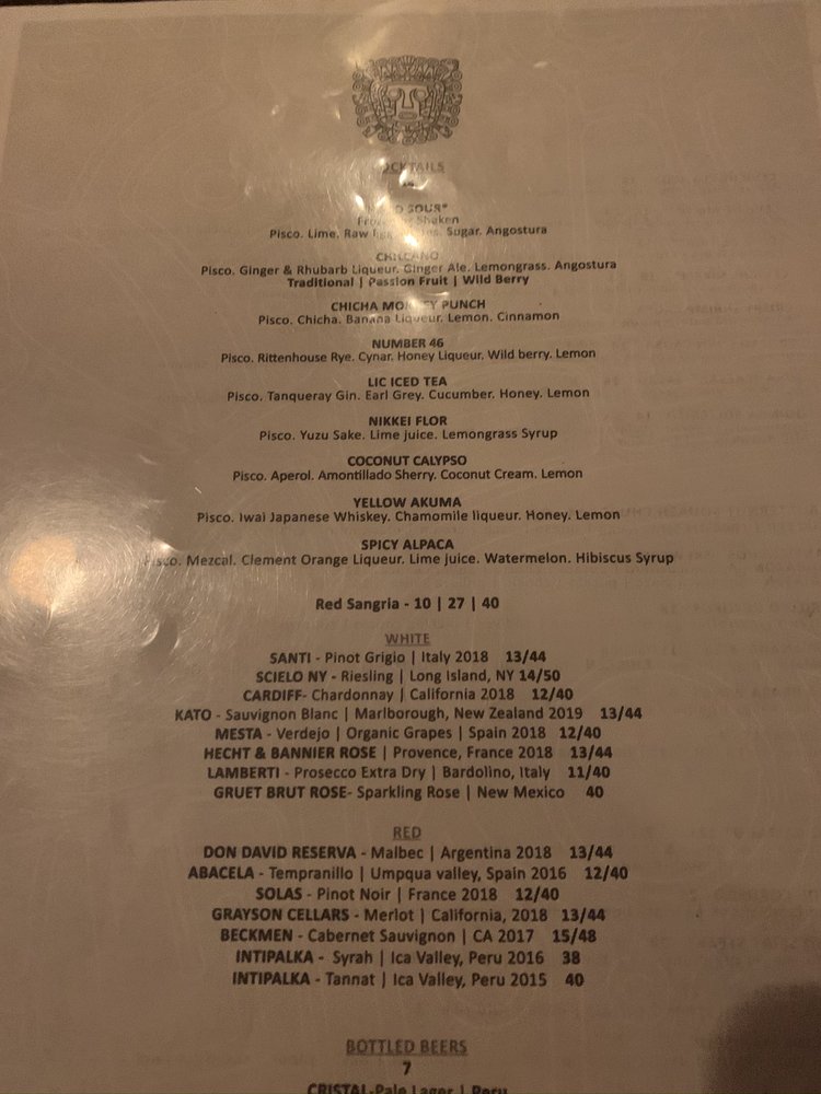 Market fish | squid | shrimp | octopus | lime | aji amarillo | red onion | choclo | cancha | cilantro